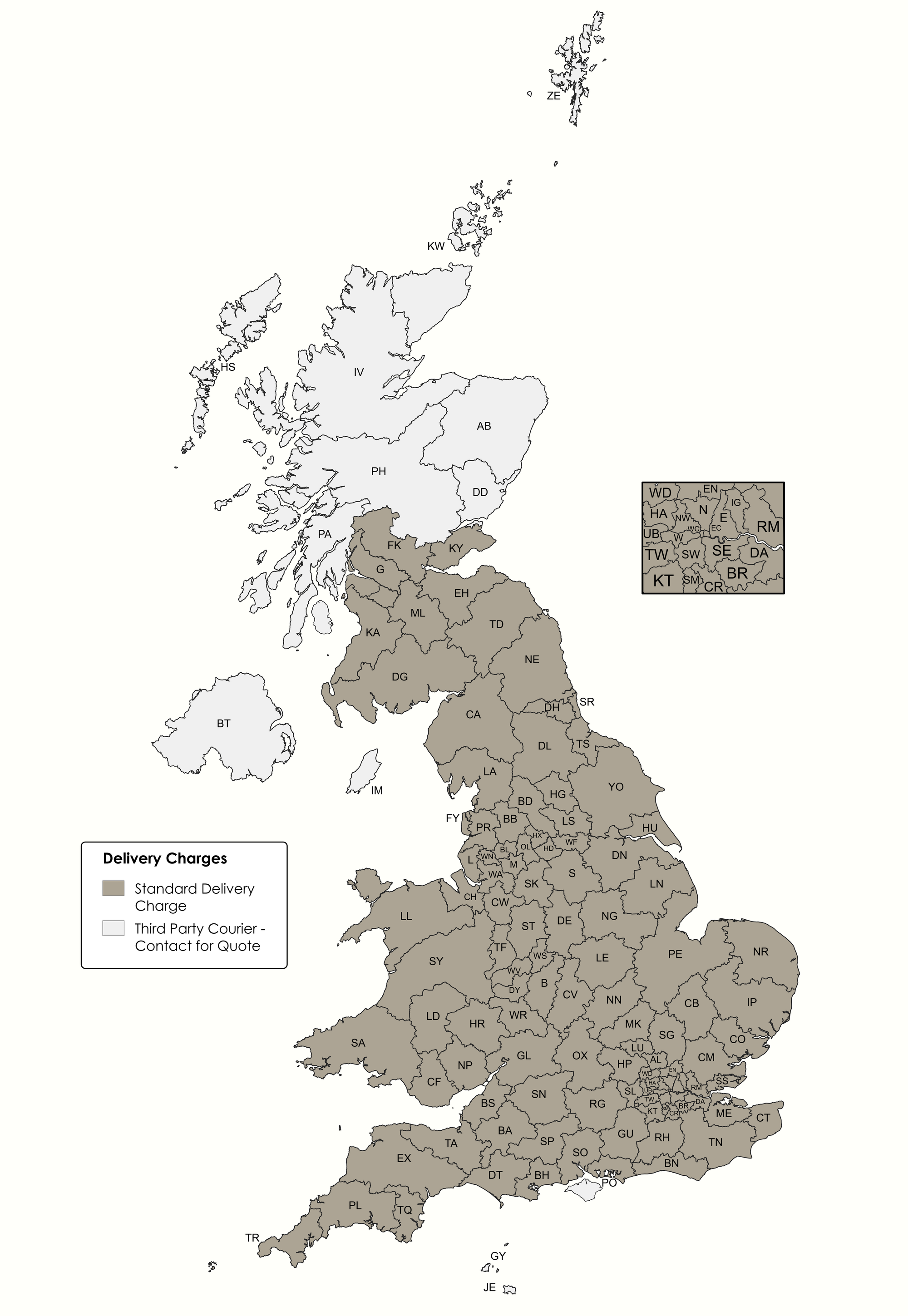 We offer standard delivery across the majority of the UK, highlighted in gold on the map below. For locations shown in light grey, delivery may be available via a third-party courier.
